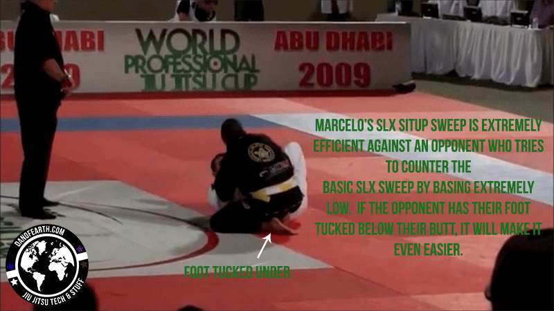 Well, Marcelo does it when guys are putting a lot of pressure into him (typically pulling on his head or collar), with their hips heavy into him, and when he can’t control their non-SLX sleeve. He does it when they are based off to the non-threatened side and keep their leg back. He does this regardless if he has an underhook or overhook.